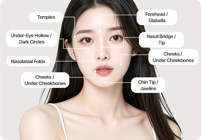 various areas—such as improving deep wrinkles, correcting hollow cheeks,